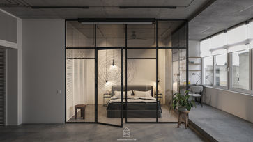 Эта квартира находится на последнем 26-том этаже киевской новостройки. Раньше это было помещение мастерской, но сейчас это шикарная квартира с большими окнами и разноуровневым потолком, нижняя отметка которого 3 метра. Наша заказчица большая любительница всего бетонного, аскетичного и минималистичного.