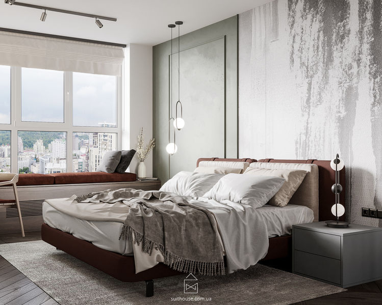 Хозяйская спальня в этом проекте имеет несколько зон: зону сна, зону для чтения, гардеробную часть и makeup зону. Цветовая гамма достаточно спокойная, располагающая к отдыху. Главным цветовым акцентом является бордовый цвет, который прослеживается по всей квартире. Сам по себе этот цвет довольно яркий и будоражит, но в умеренных количествах и приглушенных оттенках уместен в зонах отдыха.
